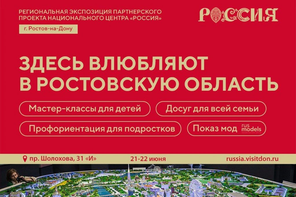 21 и 22 июня в мультимедийном музее «Россия – моя история» в рамках региональной экспозиции партнёрского проекта национального центра «Россия» состоятся дни Ростова-на-Дону. Площадка принимает гостей с 10:00 до 16:00 по адресу: г. Ростов-на-Дону, пр.Шолохова, 31И. Посетители выставки смогут посмотреть в экспозиционных залах показ мод, фильмы и тревел-шоу про Донской край и его столицу, увидеть творческие работы ростовских фотографов, принять участие в интерактивах и дегустациях. Кроме того, гостям будет доступна недавно открывшаяся выставка «Без права на забвение», архивные документы и артефакты которой раскрывают ранее засекреченные материалы времен Великой Отечественной войны. Напомним, региональная экспозиция — партнерский проект Национального центра «Россия» и является продолжением Международной выставки-форума «Россия», проходившей в Москве на ВДНХ. Площадка предлагает жителям и гостям города познакомиться с достижениями региона в промышленности, цифровых технологиях, агропромышле
