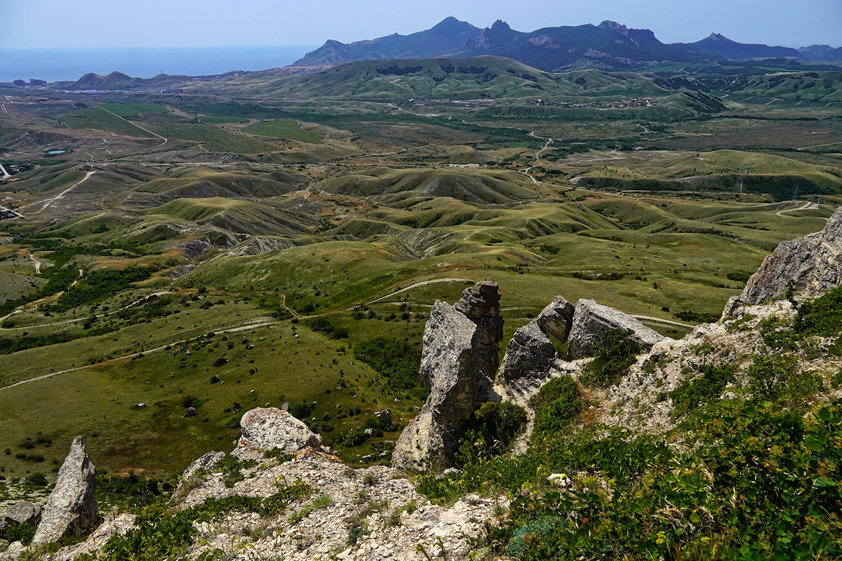 Вдоволь нагулявшись на вершине горы Коклюка, мы вернулись в автомобиль и направились в сторону западных склонов Кара-Дага в поселок Щебетовка. По дороги остановились у родника. Правда, к роднику я не пошел, занявшись съемкой вершин на северных склонах массива Кара-Даг.