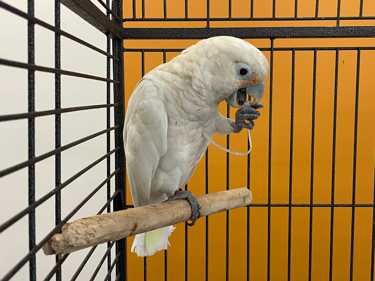 1 какаду Гоффина, очень умный и самый непоседливый Чики, Чикен, назвали его так, потому что когда он приехал, выглядел как курочка 😊 Считается, что интеллект этого вида примерно соответствует интеллекту ребенка 6-7 лет, например, он научился открывать замки у клетки. У него есть коробочка со всякой всячиной, которую он обожает грызть.