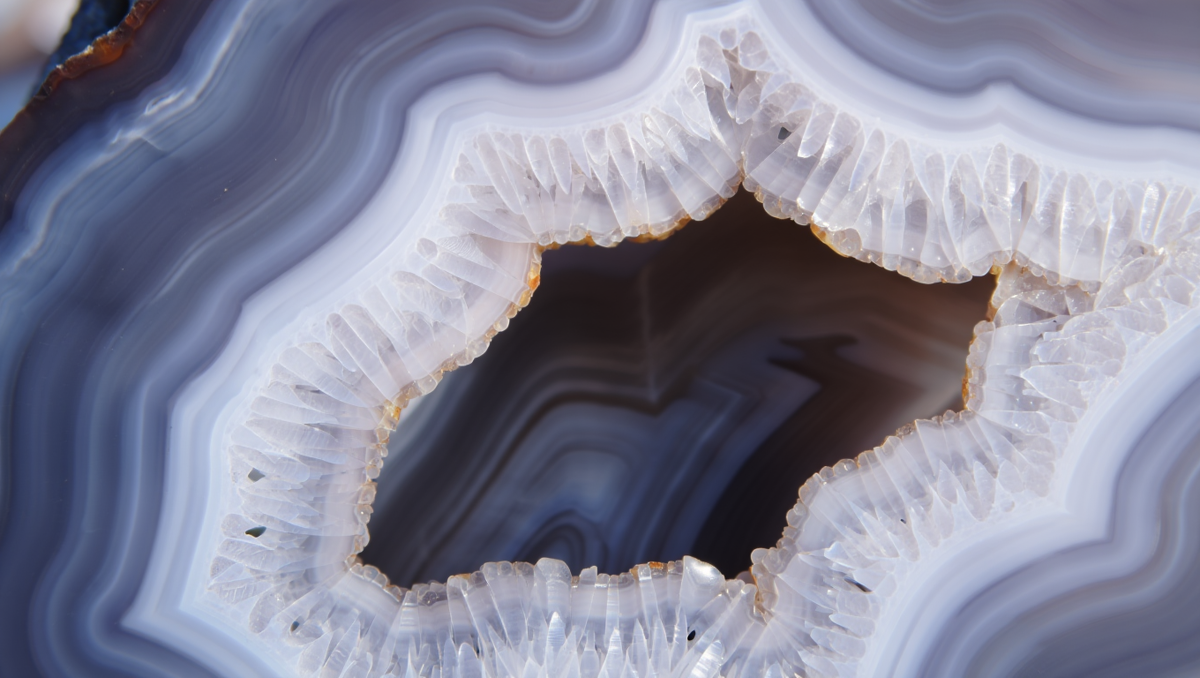 Отложение слоёв: Кремнезём постепенно осаждается на стенках пустот, формируя концентрические слои агата.