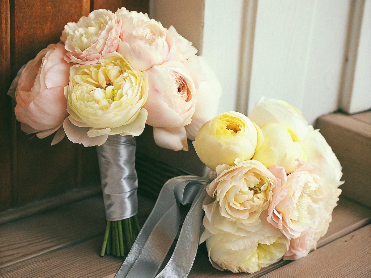 - Элегантная монохромность. Композиция из пионов Sarah Bernhardt и роз White O’Hara, оформленная в светлых тонах с серебристыми лентами. Легкая, воздушная, но при этом статусная. Такой букет будет стоить от 12 000 ₽ и особенно уместен для свадеб и утонченных поздравлений.