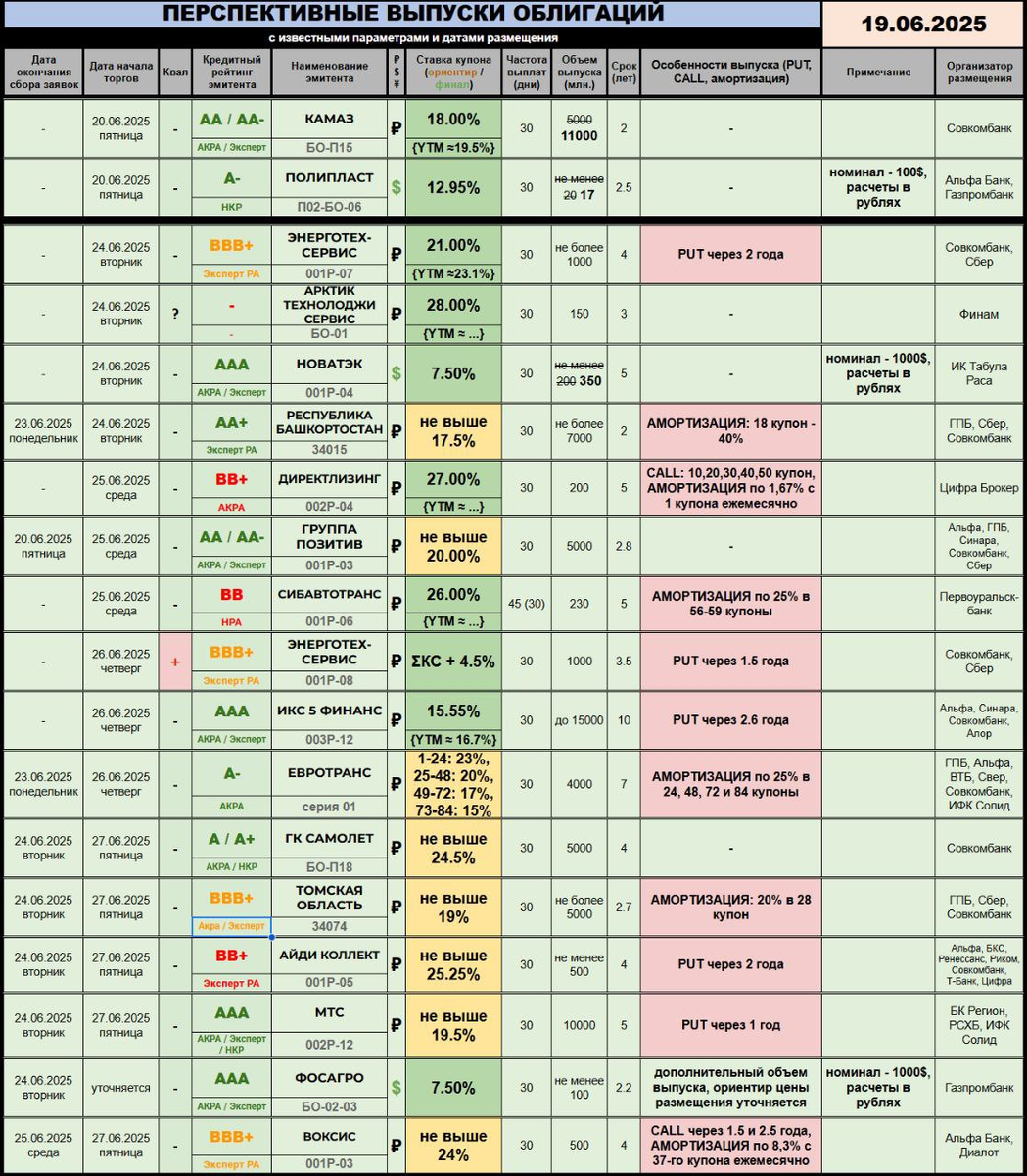 ---------- 🆕 НОВЫЕ РАЗМЕЩЕНИЯ / АНОНСЫ: 🔆 АРКТИК ТЕХНОЛОДЖИ СЕРВИС (без рейтинга) начнет размещение дебютного выпуска на 150 миллионов рублей 24 июня. Бумаги трехлетние, без оферт и амортизаций. Ставка на весь срок обращения - 28% ровно. Компания позиционирует себя как золотодобытчика, но совсем крохотного. Увы, но доверять деньги на текущем рынке дебютанту без оценки кредитного качества и без какой-либо купонной премии сейчас не лучший вариант. Организатор - Финам. 🔆 МТС (🅰️🅰️🅰️) планирует собрать 10 миллиардов рублей в рамках выпуска 002Р-12 24 июня. Пятилетние бумаги ограничивают радость пут-офертой уже через год, учтите эту тонкость. Купоны ежемесячные, стартовый ориентир - не выше 19,5%. Торги начнутся 27 июня, организаторы - БК Регион, Россельхозбанк и ИФК Соли
