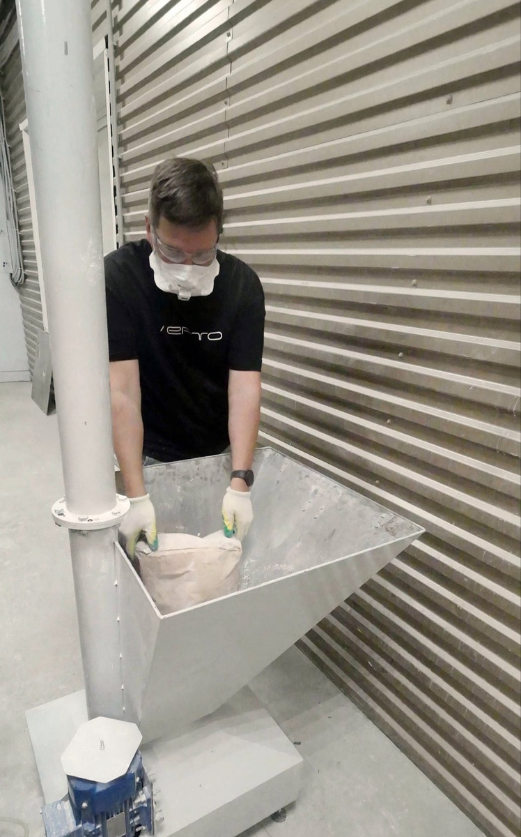 Стремянка хоть и полезный инструмент, но небезопасный и неудобный, особенно когда в руках человека утяжелители в виде мешков со смесью. Эдакий перманентный эквилибризм. А представьте, если идёт печать изделия высотой 2 метра, соответственно, картридж сухой смеси поднимается выше напечатанного изделия. Значит человек от пола уже выше на 2,5 метра. В таком случае должна быть соответствующая защита при работе на высоте. Это другие допуски, сложности и риски. При этом на высоте никогда не получается выгрузить мешок так, чтобы не разлетелось облако цементной пыли, в котором оказывается человек.