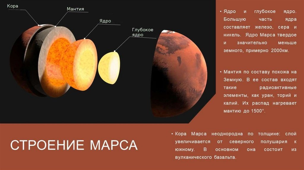 В центре Марса находится ядро, которое, по мнению ученых, состоит в основном из железа с примесью серы. Размер ядра меньше, чем у Земли, и, вероятно, оно находится в твердом состоянии. Отсутствие жидкого внешнего ядра объясняет отсутствие глобального магнитного поля, которое защищало бы планету от солнечного ветра.
