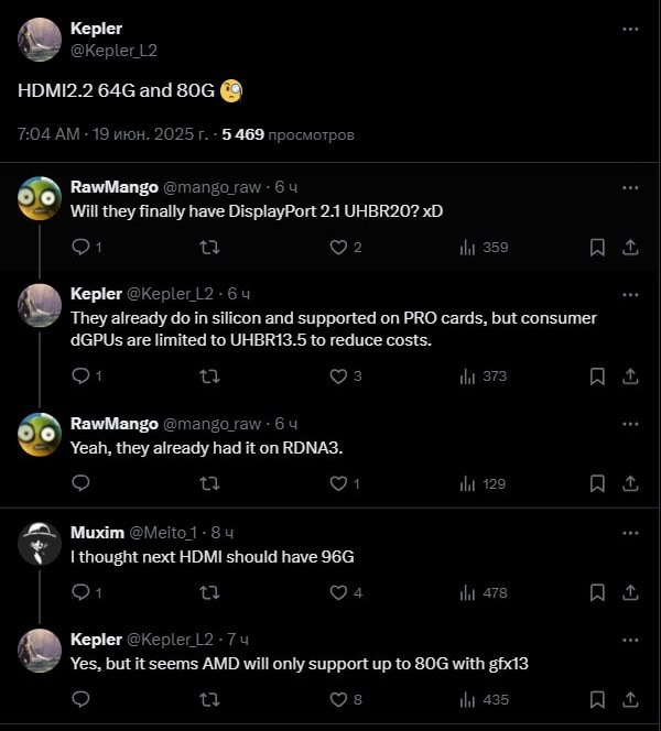 Графические процессоры AMD на архитектуре GFX13 (RDNA 5 / UDNA) получат поддержку HDMI 2.2 с пропускной способностью до 80 Гбит/с, что выше лимита HDMI 2.1 (48 Гбит/с), но ниже максимума HDMI 2.2 (96 Гбит/с). Инсайдер Kepler подтверждает два режима — 64 и 80 Гбит/с; поддержка 96 Гбит/с пока отсутствует, причины неизвестны (аппаратные или программные ограничения). Так же пока неясно, будет ли в GFX13 поддержка DisplayPort 2.1b.