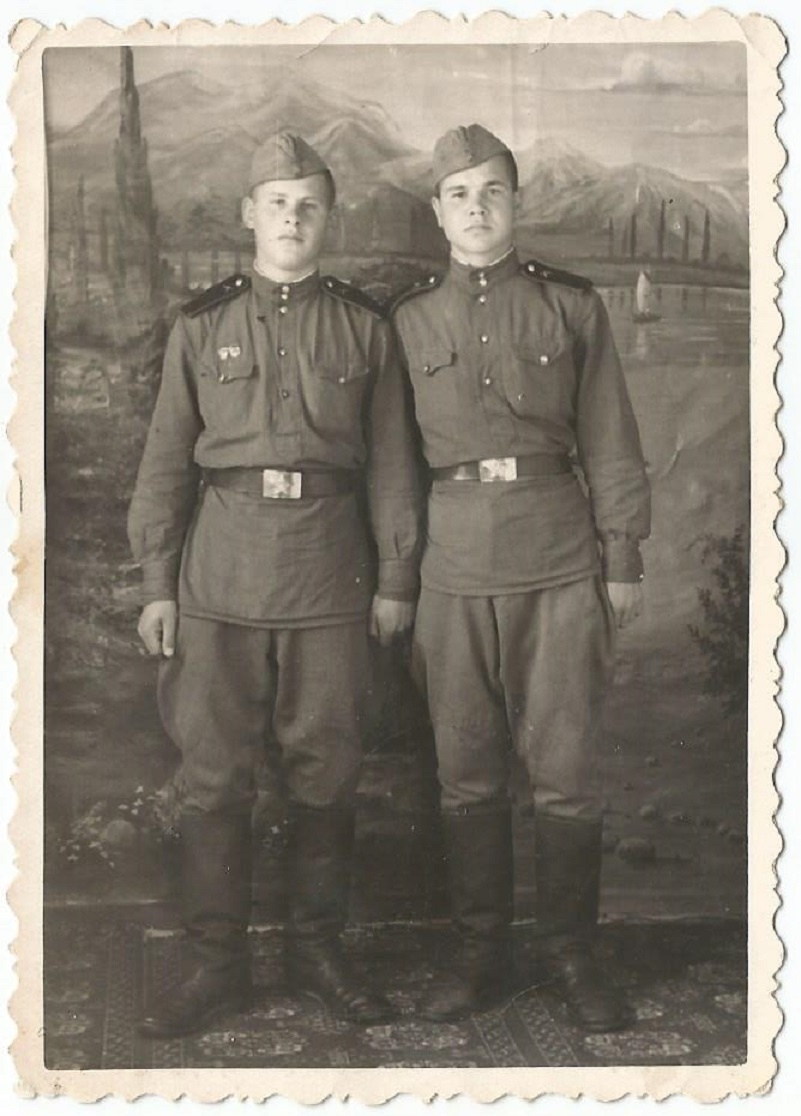 Студийный фотоснимок двух рядовых артиллерии в повседневно-полевой форме одежды образца 1956 года (Приказ министра обороны СССР №120 от 4 августа 1956 года). Обращают на себя внимание погоны солдат – они изготовлены по техническим условиям 1947 года (с кантами), но эмблемы артиллерии на них установлены уже по приказу 1955 года – ближе к пуговице. Таким образом, военнослужащие продолжали использовать имевшийся в войсках запас погон старого образца. На оборотной стороне снимка имеется подпись: «На память сестре Тони от Александра В. 27/XI-56 год». Фото из коллекции автора. Если вы хотите поделиться своими фотографиями 1930-1990 годов – присылайте их на почту istorikmoskalev@mail.ru, и они будут опубликованы на канале.