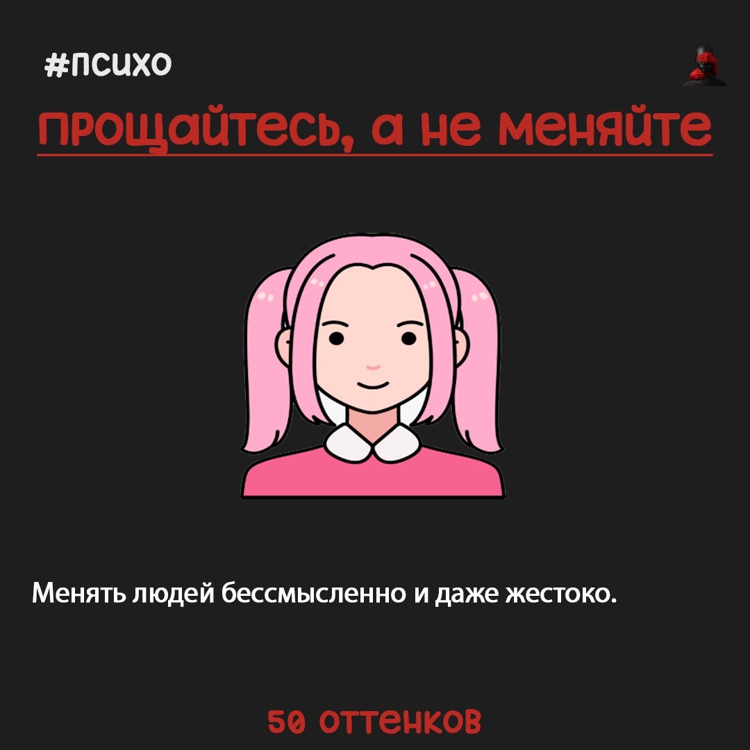 Прощайтесь, а не меняйте Менять людей бессмысленно и даже жестоко. Если вас что-то сильно не устраивает в партнере, лучше просто отпустить, чем пытаться его переделать. 📌Каждый заслуживает быть любимым таким, какой он есть Прощаться больно, но жить с не своим человеком — еще больнее. Не ломайте ни его, ни себя. Пусть домосед найдет себе домоседку, а путешественник — любительницу приключений Вы согласны? ❤️ — Да 🔥 — Нет 📌50 оттенков манипуляций