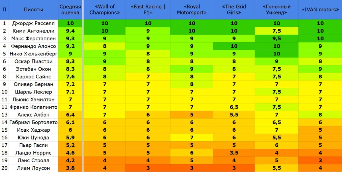 Оценки гонщиков на гран-при Канады: На этот раз лучших несколько, но к кому точно было не придраться, так это Рассел - идеальные и суббота и воскресенье. Также из своих машин выжали максимум и уверенно определи напарников Халк и Алонсо. Сразу за ними Макс, который вырвать первую строчку в квале не смог, а на старте Джордж вновь оказался быстрее. По штрафным баллам Макса пока все спокойно. Реальный темп Макларена в Канаде не стал понятнее даже после гонки, однако Оскар приехал 3 в квале и 4 в гонке, возможно на выступлении сказались их эксперименты с новыми крыльями. Посмотрим как будут обстоять дела в Австрии. Многих может удивить 7,5 у Антонелли. Да, он приехал на подиум, но весь уикенд он серьезно отставал от напарника, не попытавшись зацепиться за Макса, а 2 других его конкурента самоустранились в междоусобной борьбе. Тут же с похожими результатами Шарль, Эстебан и Карлос: Окон проиграл квалу напарнику, но зато в гонке смог приехать в хорошие очки, Саинсу в квале помешала блокиров