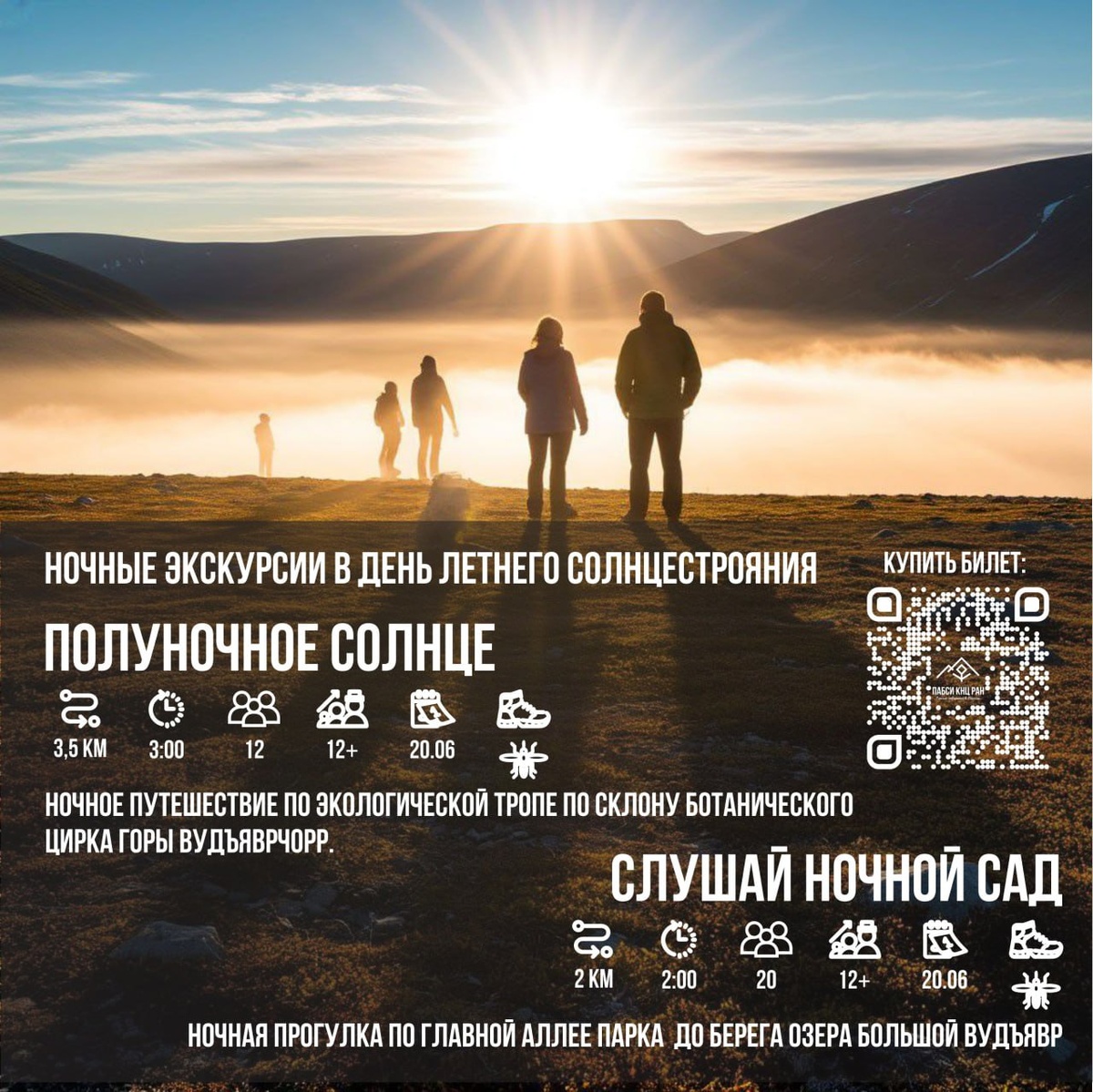 ☀️ Полуночников приглашают на ночные экскурсии в ботанический сад Полярно-альпийский ботанический сад-институт подготовил ночные экскурсии под солнцем! Гости могут выбрать маршрут: ➢ отправиться ли в ночное восхождение по экологической тропе в Ботаническом цирке горы Вудъяврчорр ➢ прогуляться к ночному озеру по главной аллее парка Какое бы путешествие не выбрали гости - прекрасная компания, интересные ботанические и не только ботанические истории, просыпающиеся после долгой зимы растения и, конечно, сюрпризы будут обеспечены! ⏰ Всех полуночников ждут 20 июня в 23:00 и в 23:30 Необходимо правильно подобрать удобную, подходящую погоде одежду и обувь. Можно взять с собой термос с горячим. Приобрести билет онлайн можно тут 👈