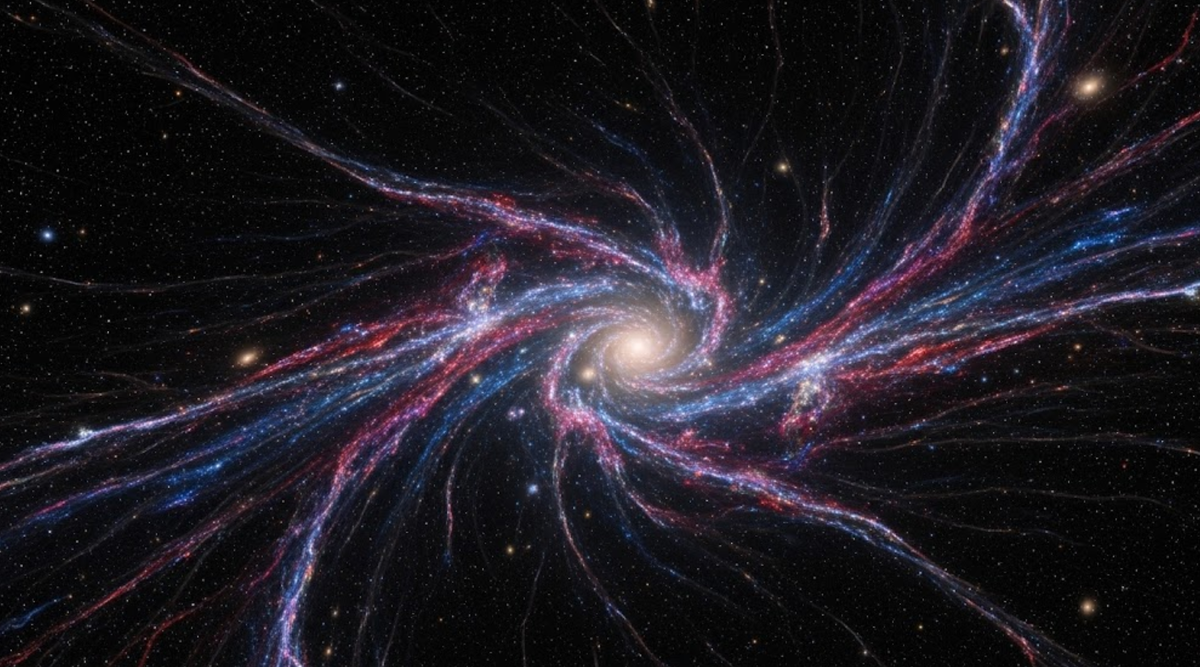 В центре исследования — Шепли-сверхскопление галактик, одно из крупнейших и плотных группировок звёздных систем в обозримой Вселенной. Учёные зафиксировали, что четыре его значимых подсистемы соединены тонкой газовой нитью, протянувшейся примерно на 23 миллиона световых лет. Температура плазмы в этой структуре превышает 10 миллионов по Цельсию, а совокупная масса сопоставима с массой нашей галактики. Согласно принятым в космологии представлениям, стандартная (или барионная) материя — та, из которой формируются звёзды, небесные тела и люди — составляет приблизительно 5% от общей массы и энергии Вселенной. Около трети этой формы вещества долгое время не поддавалась обнаружению. Учёные допускали, что она локализована в форме разрежённой и нагретой субстанции, протянутой по невидимым линиям между гигантскими структурами. Эти волокна формируют то, что называют «вселенской паутиной» (cosmic web) — невидимый «каркас» крупномасштабного устройства космоса, по которому, словно по руслам, стекали