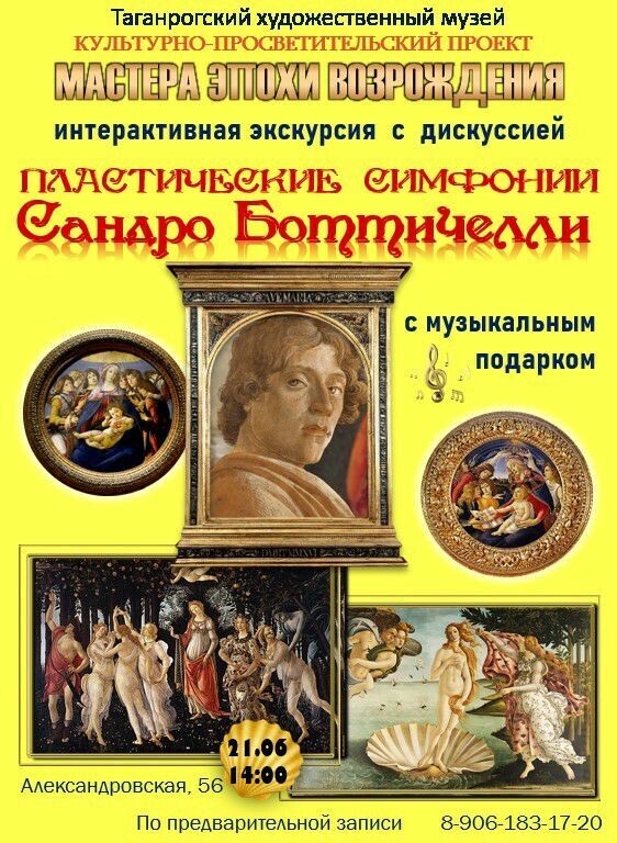 21 июня в 14:00 приглашаем вас на тематическую интерактивную экскурсию "ПЛАСТИЧЕСКИЕ СИМФОНИИ САНДРО БОТТИЧЕЛЛИ" по выставке "Мастера эпохи Возрождения".