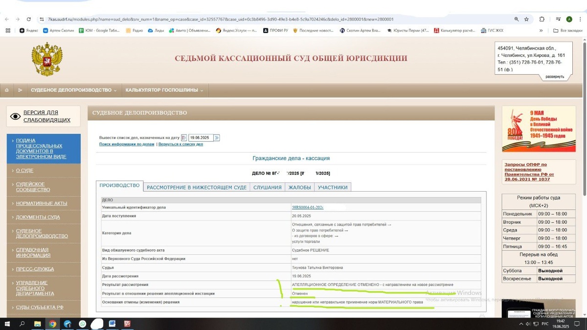 ✔ Суд кассационной инстанции поддержал нашу позицию и отменил апелляционное определение, что означает восстановление более справедливого размера неустойки.