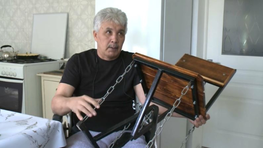 Мебель по уникальной технологии изготавливает житель села Каратаусай Актюбинской области. Марат Умбетов всю жизнь проработал сварщиком. После ДТП оказался прикован к инвалидному креслу, но, несмотря на это, продолжает заниматься любимым делом и осваивать новые для себя направления, передает корреспондент «24KZ». Житель Мартукского района Марат Умбетов проработал сварщиком 40 лет. Три года назад, после ДТП, мужчина лишился возможности ходить. Тогда же он заинтересовался принципом построения конструкций тенсегрити. Предметы, изготовленные с помощью этой технологии, несмотря на колебания, остаются прочными. Используя этот принцип, Марат Умбетов мастерит стулья и подставки для цветов. Марат Умбетов, житель Мартукского района: - Система натяжения-растяжения называется. Некоторые детали, вот эти цепи, держат на растяжение его, а одна цепь держит, чтобы она не упала. Её можно ослабить — она будет совсем болтаться. Там есть болтик, можно ослабить — он такой будет... Так и называется — «плавающ