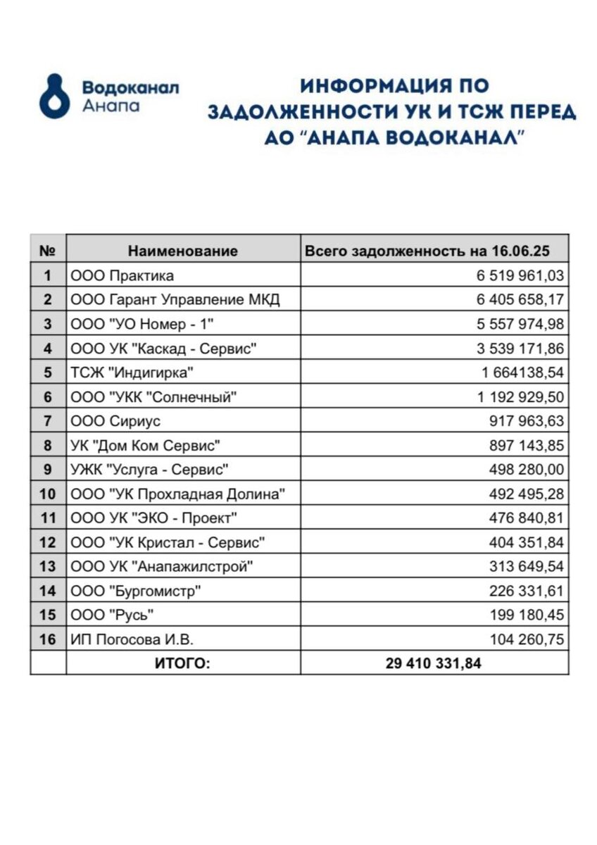 Долг за воду управляющих компаний и жителей Анапы приблизился к 30 млн рублей По информации АО «Анапа Водоканал» на 16 июня общая сумма задолженности управляющими компаниями и жителями города-курорта за водоснабжение и водоотведения составила 29 410 331,84 рублей. -Эта ситуация негативно сказывается на нашей производственной деятельности и качестве предоставляемых услуг. Мы призываем всех жителей, управляющие компании и ТСЖ как можно скорее погасить свои финансовые обязательства. Это поможет обеспечить стабильное водоснабжение и улучшить качество услуг для каждого из вас. Благодарим вас за понимание и сотрудничество,-прокомментировали в Водоканале. Ранее Новости Анапы писали, что с 1 июля стоимость кубометра питьевой воды анапчан составит 60,35 рублей (сегодня 55,08), стоимость водоотведения вырастет до 41,93 рублей (сегодня 38,30 рублей). Подписаться на Новости Анапы