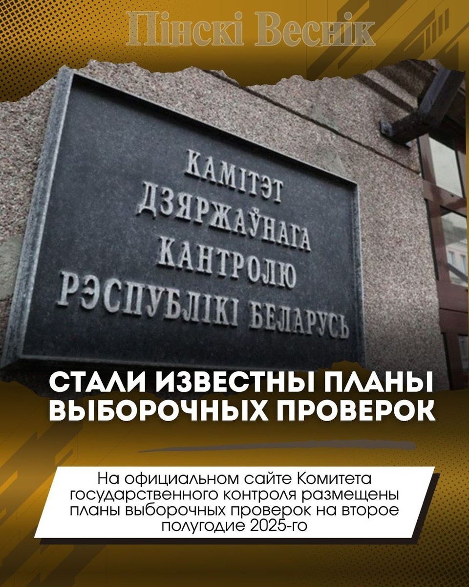 📌На официальном сайте Комитета государственного контроля опубликованы планы выборочных проверок на второе полугодие 2025 года. ✔️В Брестской области запланировано 260 проверок 230 субъектов хозяйствования, среди которых основное внимание уделено вопросам безопасности жизни и здоровья граждан. САЙТ https://kgk.gov.by/ru 📍📍@Пинский Вестник ЮТУБ | САЙТ| ИНСТ | ВК | ОК | ФЕ | Прислать новость