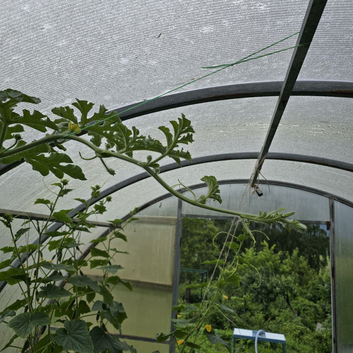 🍅РАСТИМ В ТЕПЛИЦЕ🌡 🍉Тепличные арбузики растут не по дням, а по часам. Ещё три дня назад они были размером со сливу, а сегодня уже как небольшое яблоко. 🤔В скором времени необходимо будет их поместить в сетку, которую подвяжем к перекладинам теплицы, иначе при таком стремительном наборе веса, они могут сломать свою плодоножку, а это не входит в наши планы. 🌿Почти все растения достигли высоты верхней планки теплицы и дальше им расти некуда, да и незачем. Прищипываем точку роста и направляем все силы растения на питание и рост плодов. 🥒Один арбузик по форме оказался продолговатым и сейчас похож на огромный полосатый огурец🤣 Посмотрим, что из этого "огурца" получится! 👁Продолжаем следить за появлением новых пасынков, которые сразу обрезаем, а также периодически поливаем и подкармливаем фосфорно-калийными удобрениями 1 раз в 2 недели. 👍 Дыни возле теплицы также активировались в росте и пора провести с ними некоторые манипуляции по обрезке и формировке, о которых расскажем в б