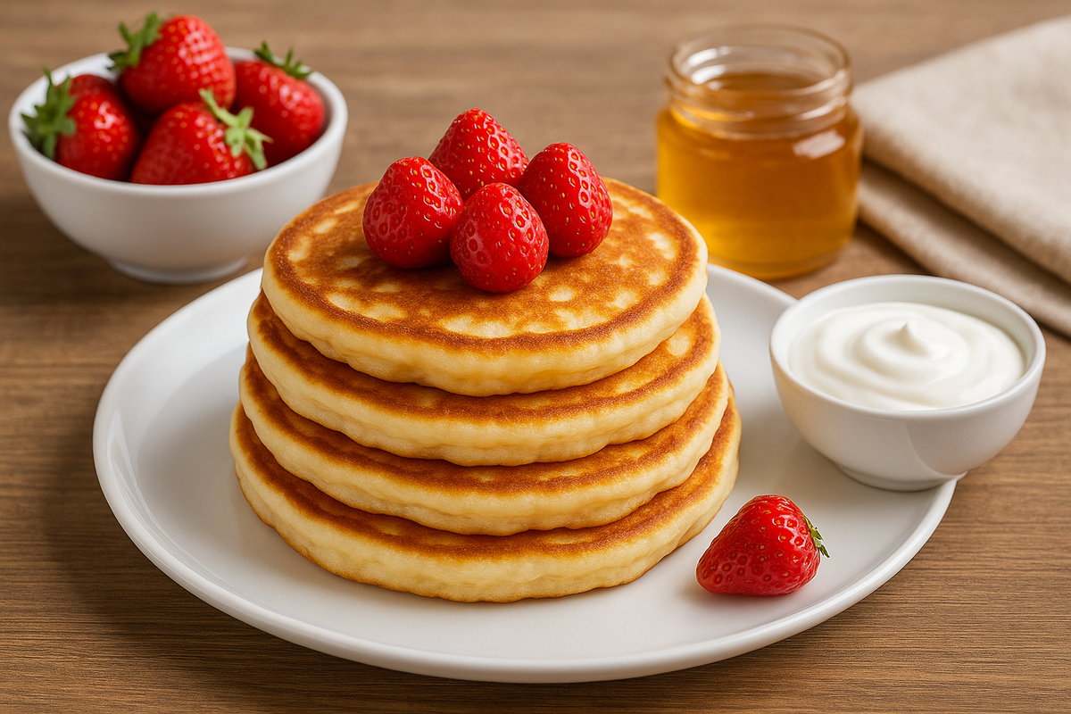 Подаем горячими — со сметаной, медом, вареньем или сгущенкой. Можно украсить ягодами или фруктами.