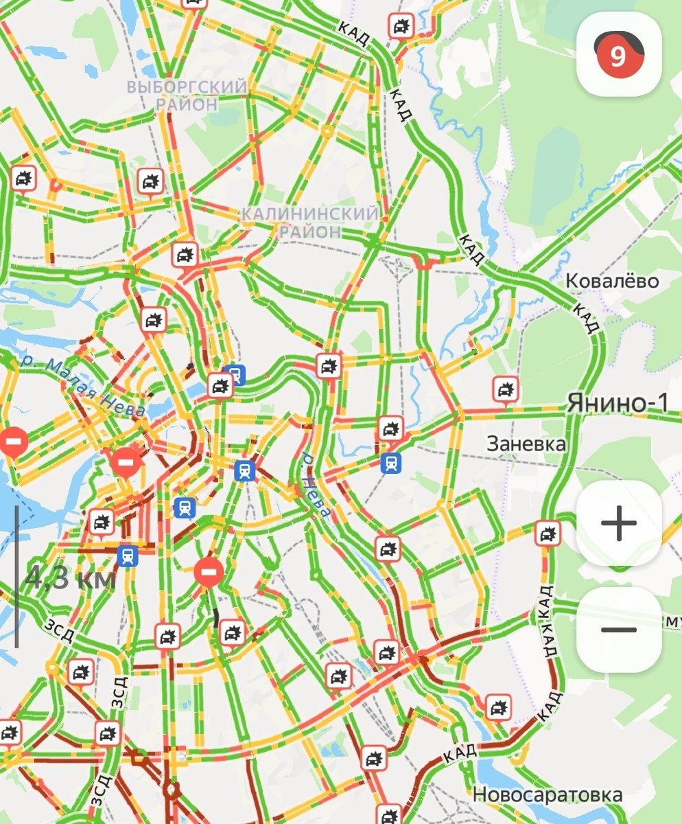 ⚠️ Дороги Петербурга окрасились в бордовый цвет: загруженность 9 баллов из 10 По данным "Яндекс Пробок" в Петербурге 9 - балльные заторы. Особенно плотно - в центре и юго - восточной части города. ДТП и ЧП Кудрово