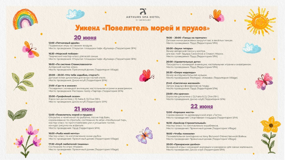 Программа анимационных мероприятий на уикенд "повелитель морей и прудов" с 20 по 22 июня
