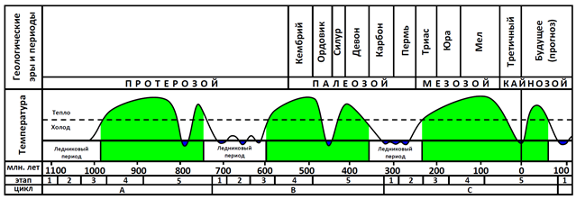 Второй ледниковый период, Гуронский, раннепротерозойский длился с 2.500 до 2.000 млн. лет назад, третий ледниковый период, позднепротерозойский длился с 900 до 630 млн. лет назад, получил название «снежок», Земля полностью была покрыта снежным покровом. Это были периоды окончательного формирования поверхности, коры Земли, образования горных пород и полезных ископаемых, зарождения одноклеточной жизни и растительности, мхи, лишайники, появления первых многоклеточных, и каждое замерзание продлевало, из-за этого, эти периоды, зарождения жизни, и сдвигало их в более поздние тысячелетия.