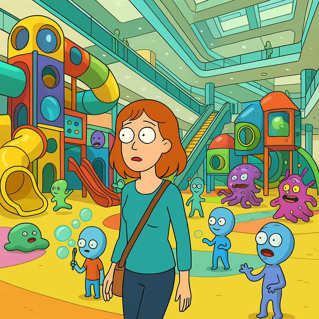 Она проснулась — или, может быть, так и не засыпала. В одно мгновение привычный мир отступил, будто лист бумаги, скомканный и выброшенный. Девушка стояла в вестибюле огромного здания — на первый взгляд это был торговый центр: эскалаторы, лестницы, вывески. Но здесь не было ни одного магазина. Вместо них — многослойные, абсурдные по форме и размеру детские площадки. Горки, закрученные в спирали, ведущие в пустоту. Батуты, прыгая по которым, можно было зависнуть в воздухе на несколько секунд — или часов. Тоннели из мягкого материала, в которых эхо от собственных шагов звучало голосами неизвестных языков. Она шла по этажам, и с каждым уровнем формы жизни становились всё более странными. — На первом — пузыреобразные существа, общающиеся через цвет. Один взгляд — и её охватило ощущение нежности и страха одновременно. — На втором — дети без лиц, которые смеялись беззвучно и строили из мыслей новые игровые комнаты. — На третьем — живые морфирующие конструкторы, напоминающие желе и LEGO одновр