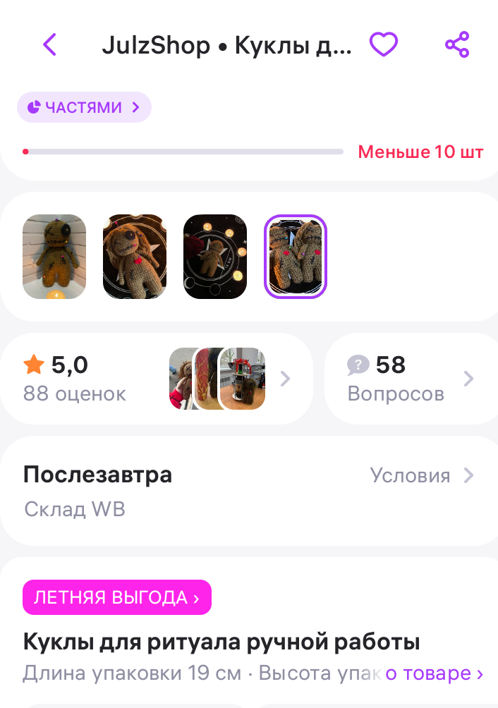 Добрый вечер. Вот так не заходишь в поисковики несколько дней, а потом кааак зайдешь, а тааам... Я в куклозавязке- вот что едет, то уже едет, ну и три коробки не распакованы. И всё- до августа). Но смотреть же никто не запрещает) Итак, что забавного и странного попалось на ВБ. 1. Захотелось поплевать через плечо и побрызгать на экран святой водой одновременно. 88 отзывов. Оценка 5.0? Аж страшно смотреть чего там))). Вот вполне безобидный отзыв Пятьдесят дизлайков, видимо, поставили жрецы вуду, возмущенные таким использованием куклы? А вот уже не совсем здорОво как-то... Большинство брали как талисман. И правильно)) 2. Бюджетные русалочки Музыкальные) В принципе сейчас и оригинал не дорого стоит. 3. Ещё одна... Русалочка Нет, я всё понимаю. Она, конечно, представляет ценность для коллекционеров, наверное Описание выглядит так, будто продают наскальную живопись, а не игрушку не такой уж давней эпохи) 3. Ну милота же!) 4. А вот карапузовская София в новой ипостаси.