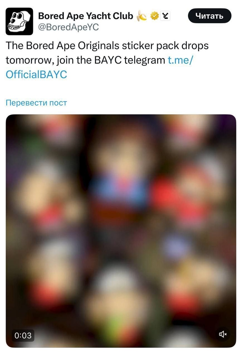 🤯 Завтра выходят стикеры от BAYC Недавно в официальном канале анонсировали выход новых стикеров от Bored Ape Yacht Club (BAYC). Если пингвины дали 10 иксов, то эти обезьяны могут спокойно дать 15-20 иксов, поэтому готовимся заранее и пробуем завтра купить. Bybit 👈 Регистрация + Бонусы