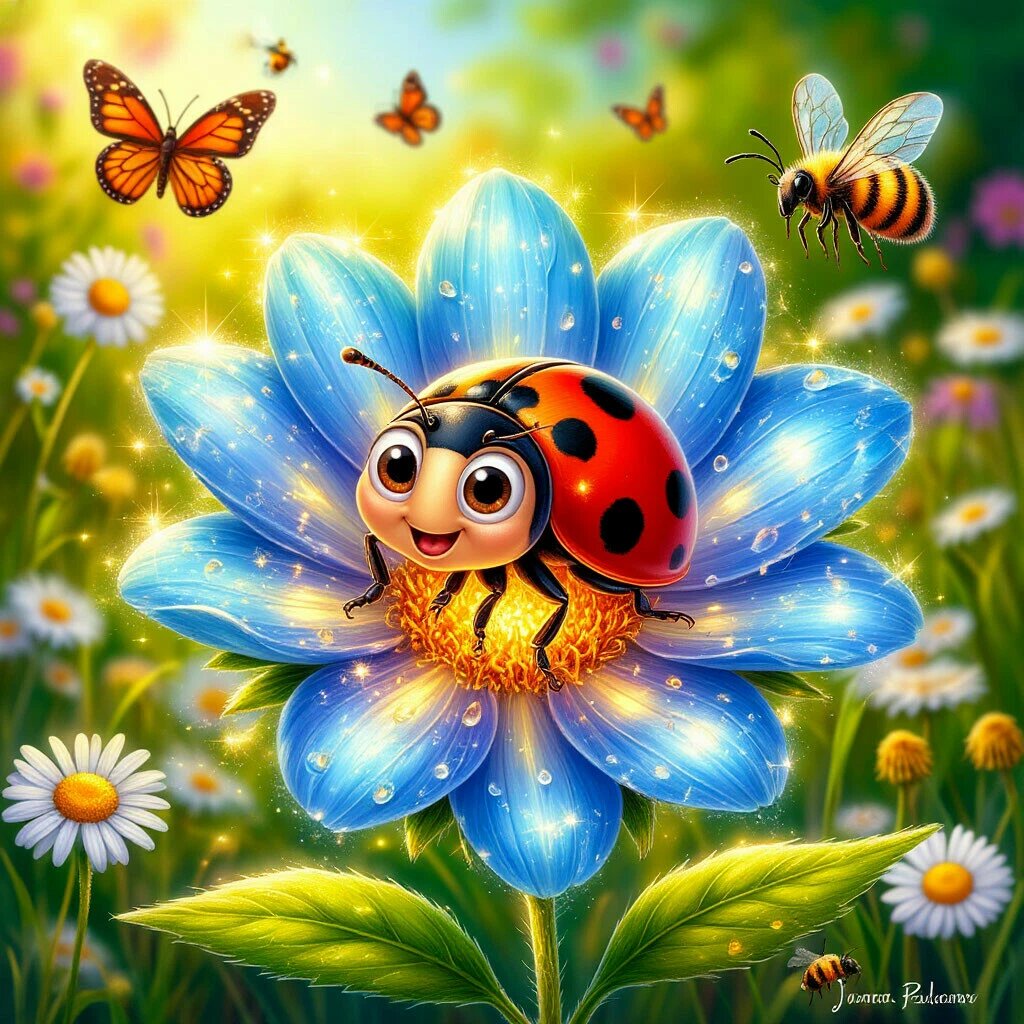 В самом солнечном уголке большого сада, где по утрам росинки переливаются, словно алмазы, жила-была божья коровка по имени Тоша. Её красный плащик с семёркой чёрных горошинок был самым нарядным во всём саду. Каждое утро Тоша облетала свои владения: проверяла, не высохла ли роса на травинках, не завяли ли цветы, не потерялся ли кто из маленьких жучков. Все в саду очень любили Тошу за её доброе сердце. Однажды, пролетая над самой дальней частью поляны, Тоша заметила что-то необычное. Среди привычных белых ромашек и жёлтых одуванчиков рос удивительный цветок — лепестки его бутона были нежного голубого цвета и слегка светились изнутри. — Какой ты красивый! — восхитилась Тоша, приземлившись рядом. — Но почему ты здесь один? — Я — волшебный цветок, — тихо сказал незнакомец. — Но я могу раскрыться полностью только тогда, когда кто-то совершит настоящее доброе дело — не за награду, а просто так, от чистого сердца. Тоша сразу же решила помочь цветку раскрыться. Она полетела по саду, высматрива