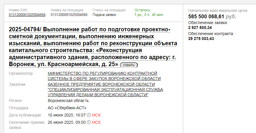 До 133 тысяч рублей может стоить ремонт 1 кв метра в административном шестиэтажном здании в центре Воронежа, оно расположено недалеко от цирка на ул. Красноармейская, д. 25. Предполагается, что из бюджета области на реконструкцию этого объекта будет выделено до 585 млн 500 тысяч рублей. Такая сумма содержится в аукционной документации на сайте госзакупок, торги запланированы на 26 июня. В опубликованных документах к закупке, как и в открытом доступе, практически нет никакой информации о нынешнем функциональном назначении этого объекта. В последние годы советской власти его возвели для телефонной станции (АТС). В некоторых источниках сообщается, что сейчас в этом административном здании располагаются помещения нескольких операторов мобильной связи. А с учетом того, что заказчиком проведения реконструкции этого объекте выступает казенное предприятие «Специализированная эксплуатационная служба управления делами Воронежской области», то здание, вероятно, находится в собственности Воронежск