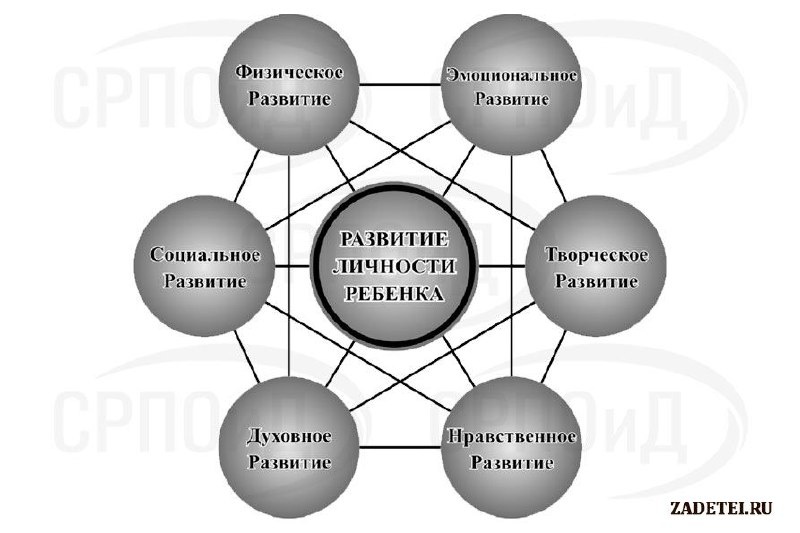 Суть схемы проста — мы располагаем по кругу шесть сфер развития, шесть элементов. Седьмой элемент – это наша цель: развитие личности ребенка. Её мы помещаем в центр. Далее, между всеми элементами проведем линии, которые будут символизировать их постоянное и общее взаимодействие.