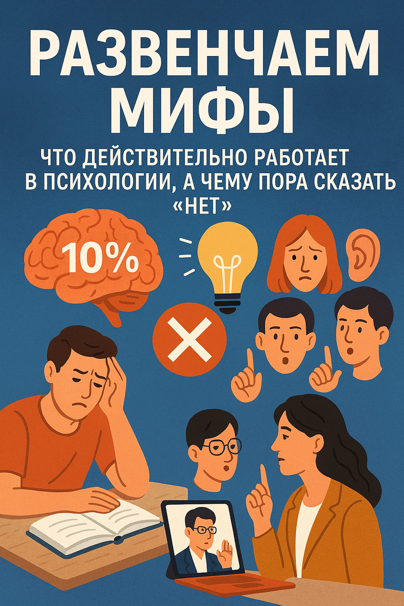Психология окружена массой легенд и заблуждений: одни люди всерьёз верят, что с помощью силы мысли можно вылечить любую болезнь, другие уверены, что тесты на типы личности работают как по нотам. Разбираемся, какие утверждения о человеческом разуме — правда, а какие — мифы, уводящие нас в сторону. Миф 1. «Мы используем только 10 % мозга» Миф 2. «Каждый учится по своему стилю: визуал, аудиал или кинестетик» Что действительно важно: Миф 3. «Кризис среднего возраста — неизбежен» Миф 4. «Запоминание в разы лучше, если учиться лёжа» Эффективные приёмы: Миф 5. «Детские травмы определяют всю жизнь» Что помогает исцелиться: Миф 6. «Психолог — это тот, кто всегда говорит «я всё знаю»» Как выбрать специалиста: Психология развивается — старые мифы сменяются новыми открытиями. Чтобы не запутаться в информационном шуме, опирайтесь на проверённые исследования, не бойтесь задавать вопросы специалистам и экспериментируйте с техниками, адаптируя их под себя. Ваш мозг куда мощнее 10 % возможностей, а нас