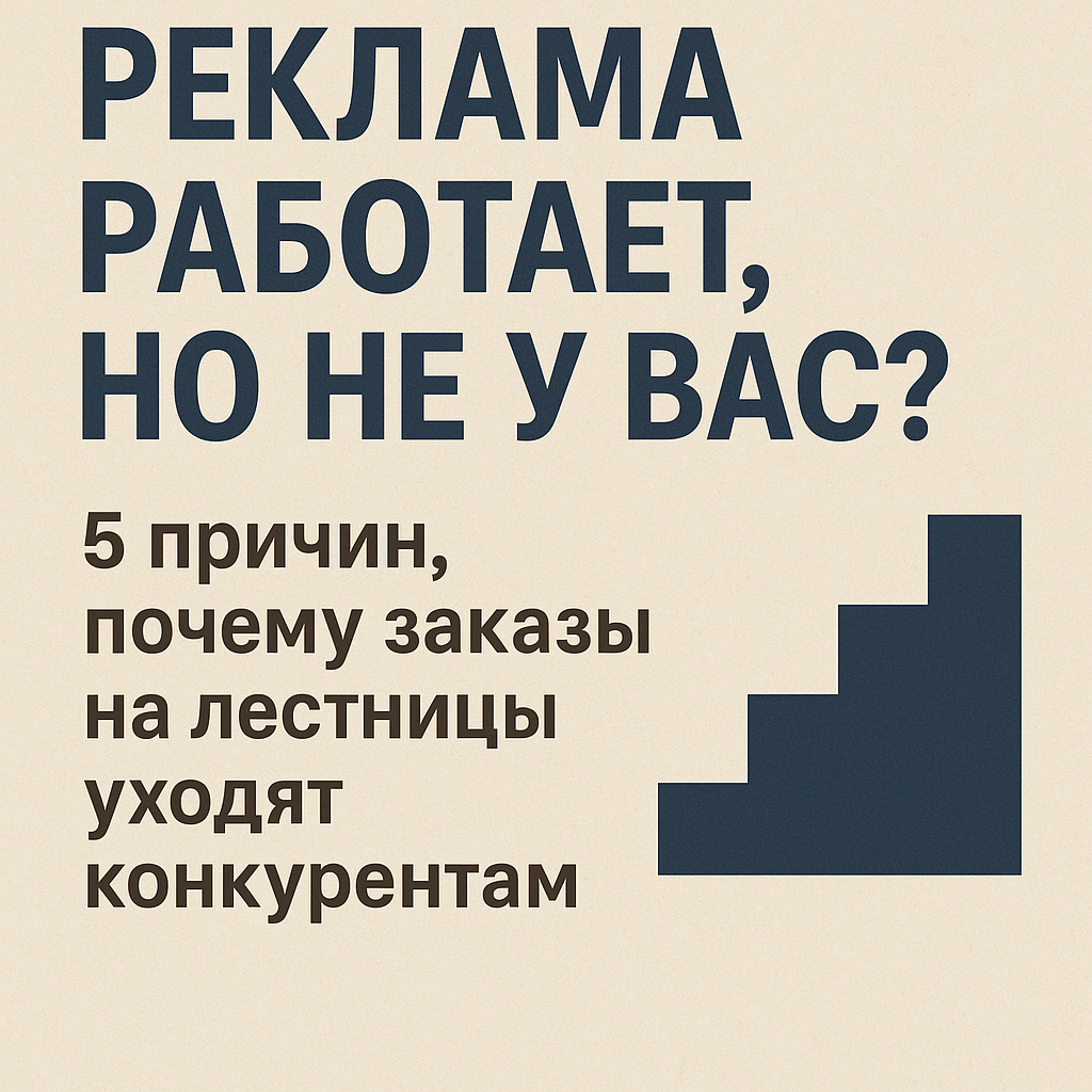 Ответ жёсткий: реклама настроена неправильно — и вы каждый день теряете деньги. 📉 87% клиентов уходят к конкурентам. Не потому что у них лучше — а потому что они правильно используют рекламу. В этой статье — 5 причин, почему реклама не приносит вам клиентов. И как получить 60 заявок в месяц по 900 ₽, не сливая бюджет. Если в ключевых фразах есть «фото лестниц» или «лестница своими руками» — вы кормите Яндекс, а не получаете лидов. 📉 Что было: