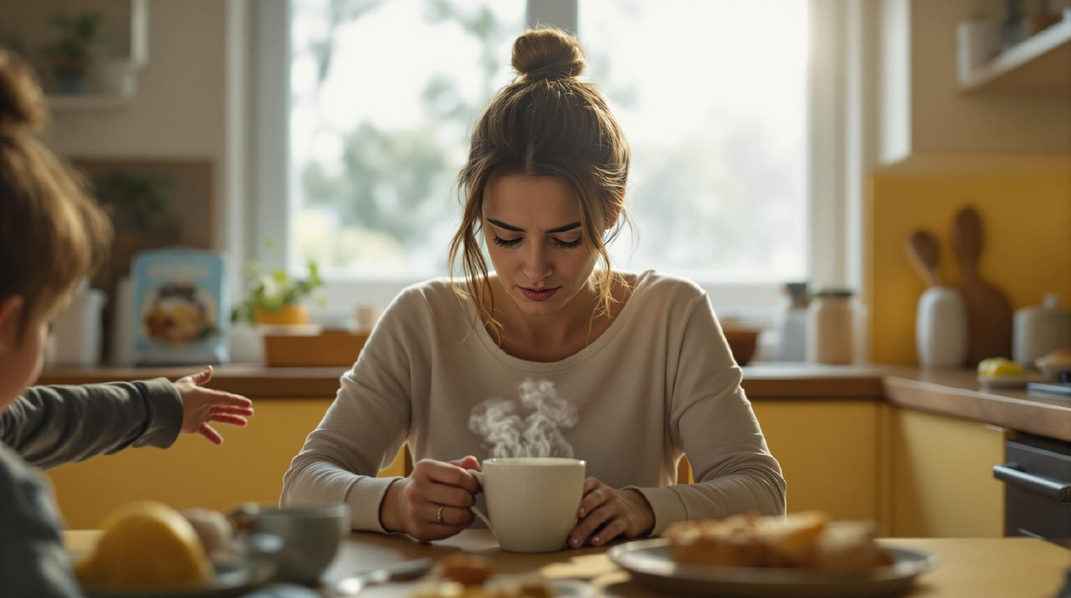 Кухонные часы показывают половину седьмого утра. За окном ещё серо, но дом уже пульсирует привычным ритмом начинающегося дня. Запах кофе смешивается с ароматом детского завтрака. В этой утренней тишине — треск сковородки, шипение масла, мерное тиканье.