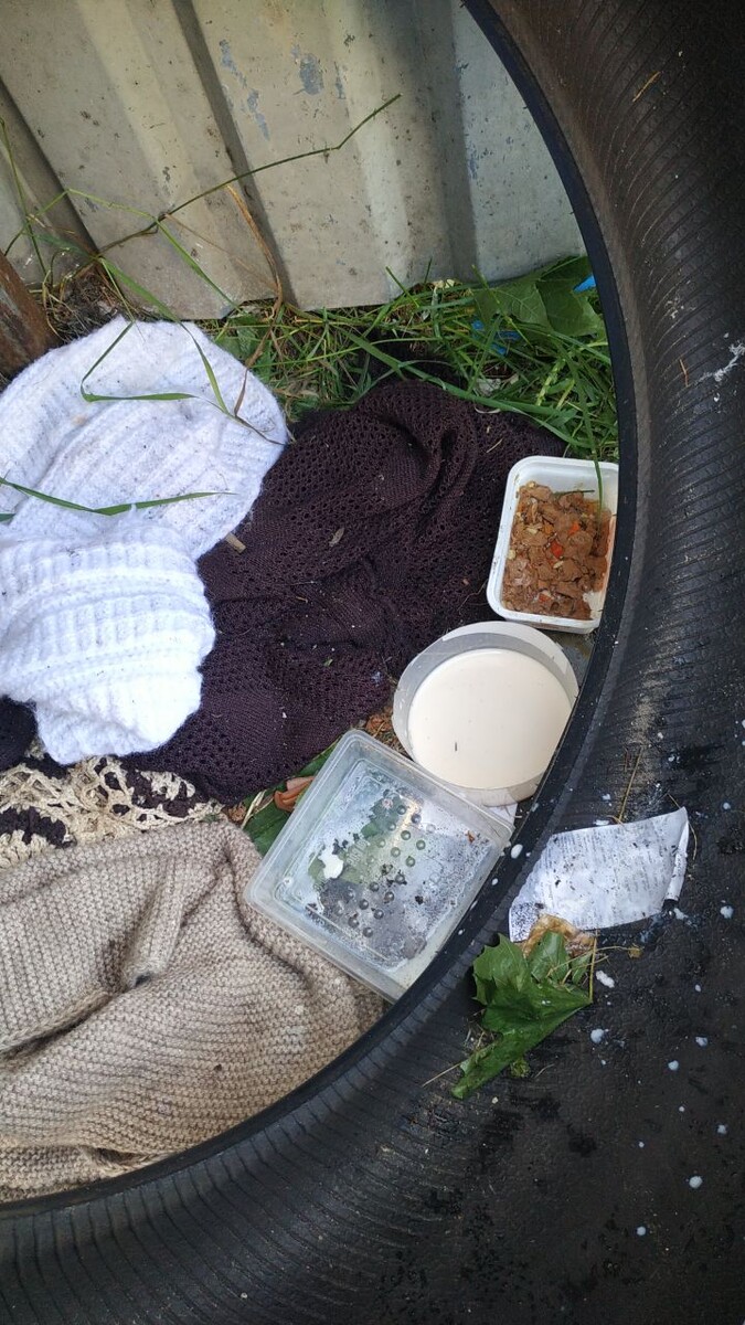 📣 "Заботливые" ручонки положили тряпочек, поставили мисочки, молока и еды навалили крошкам...мол, ешьте и выживайте как хотите!😠 Да, под покрышку спрятали...