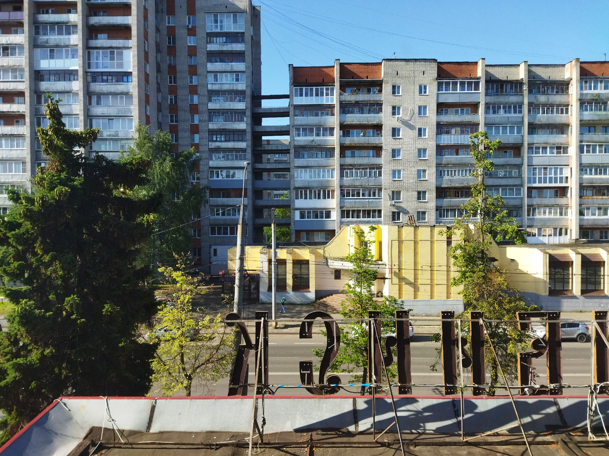 Проснулись в 7:30. В гостинице "Рыбинск'' в Рыбинске нет услуги завтраков. Но нам подсказали, что через дорогу есть кафе, открывающееся в 8 утра, где можно поесть. Мы решили пойти туда. Вид из окна номера на кафе "Дело вкуса" в Рыбинске. Кафе "Дело вкуса" в Рыбинске. Позавтракали хорошо. Подробный отзыв о нашем завтраке можно прочитать здесь Затем выехали из гостиницы после 9:10. Сегодня мы хотели осмотреть два объекта в Рыбинске: каскад волжских ГЭС и скульптуру Волга-мать. Они располагаются на другой стороне Волги от нашей гостиницы. Сигнал GPS так и не восстановился, но мобильный интернет был, поэтому я вновь работал навигатором по построенному маршруту. Мы проехали по дороге вдоль водохранилища, похожей на ту дорогу, по которой ехали вчера. Потом выехали к серо-унылому зданию, очевидно, связанному с ГЭС. Но мы хотели посмотреть, как вода падает с плотины ГЭС, поэтому углубились в улицы местного значения. Уткнувшись в закрытую территорию, поняли, что падающую воду здесь не по