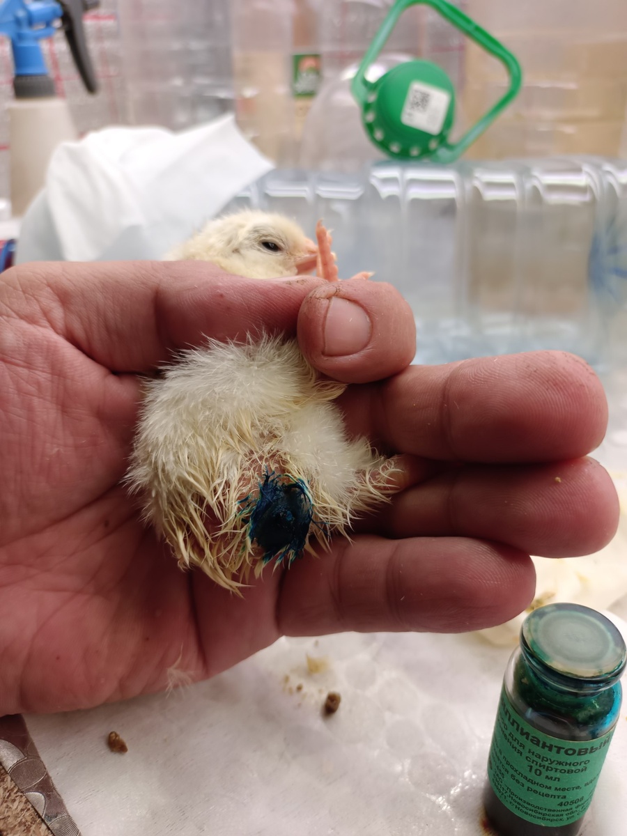 У цыплёнка, 4-го, который никак вылупится не мог и ему я помог это сделать — малость проблемы. С пуповиной думаю. Зелёнка подсушит и торчать ничего не будет. Такова моя операция сегодня.