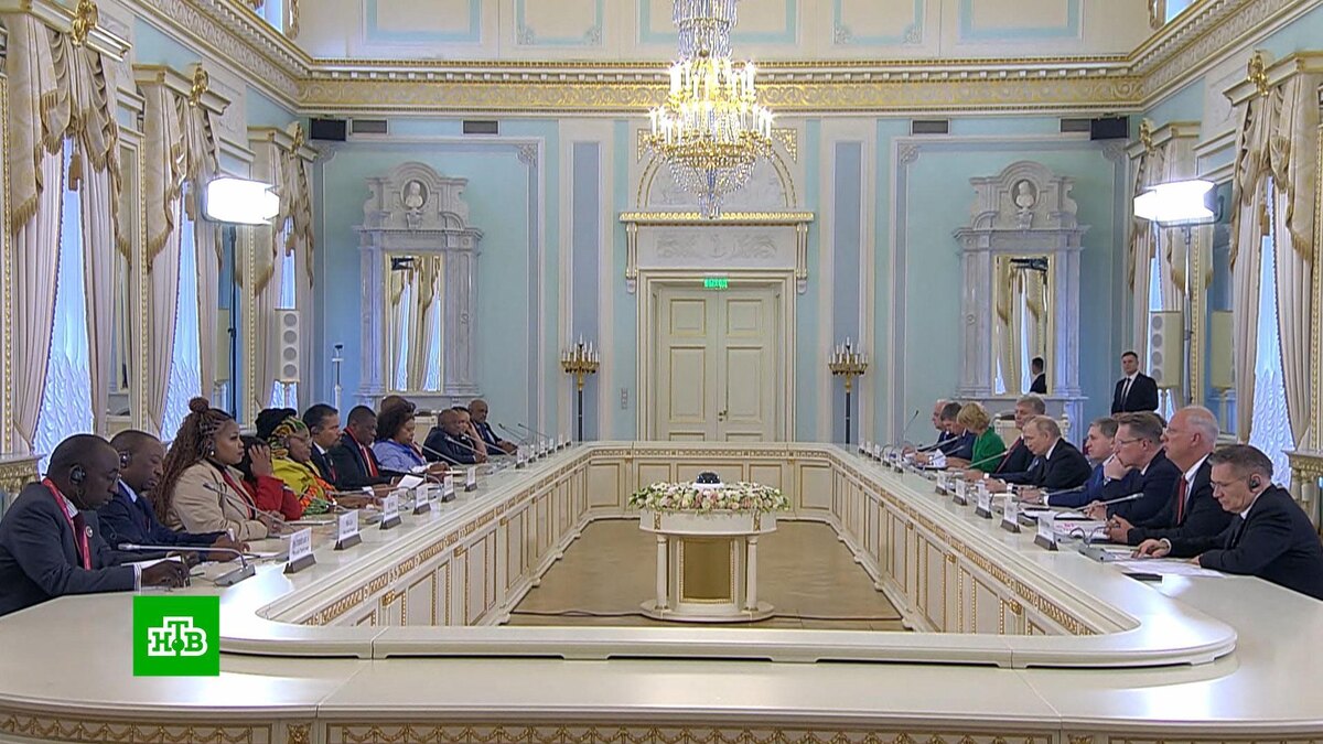[ Смотреть видео на сайте НТВ ] Глава российского государства принял в Константиновском дворце делегацию из ЮАР во главе с вице-президентом Полом Машатиле. Сегодня вечером Владимир Путин встретился в Константиновском дворце с вице-президентом ЮАР Полом Машатиле, который прибыл в Санкт-Петербург в том числе и для работы на ПМЭФ, где уже поучаствовал в российско- южноафриканском бизнес-диалоге. Как отметил глава российского государства, сотрудничество двух стран развивается на принципах всеобъемлющего стратегического партнерства, равноправия и взаимного уважения. Путин, по его словам, находится в постоянном контакте с лидером ЮАР Сирилом Рамафосой, а на международных площадках Москва и Претория придерживаются схожих позиций. Владимир Путин, президент России: «Россия и ЮАР солидарны в подходах к решению актуальных вопросов глобальной повестки дня.Мы координируем свои усилия на международных площадках. В целом укрепление связей со странами Африки является одним из наших приоритетов. По ито