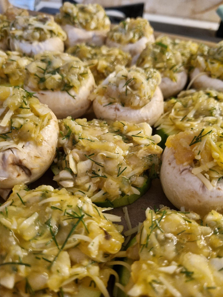 Вот все же для меня готовка/кулинария - это процесс абсолютного творчества. Рецепты рецептами, а что-то свое внести -обязательно. А еще лучше - придумать свой рецепт и порадовать семью! Вчера хотела запечь фаршированные шампиньоны, но начинки сделала много, а грибов не хватило, поэтому импровизировала вот так: Шампиньоны помыть, удалить ножки. В шляпки насыпать сыр. Кабачки нарезать кружочками толщиной 1,5-2см, тоже чуть-чуть присыпать сыром. Начинка: фарш из куриного филе, свежий укроп мелко нарезанный, чеснок через пресс, мелко порубить ножки грибов, соль, яйцо, чуть-чуть сыра. Все перемешать, посолить по вкусу(но помнить,что сыр тоже соленый!). Выкладываем начинку в грибы и на кабачки. Все выкладываем на противень и в духовку при 200°С на 30 минут (смотрите по готовности). Как появилась румяность - вынимаем и подаем к столу. Моя семья оценила кабачки больше, чем грибы, хотя и то, и другое получилось очень вкусно, как по мне. Жду помидоров, еще с ними так попробую сделать. Мне ка