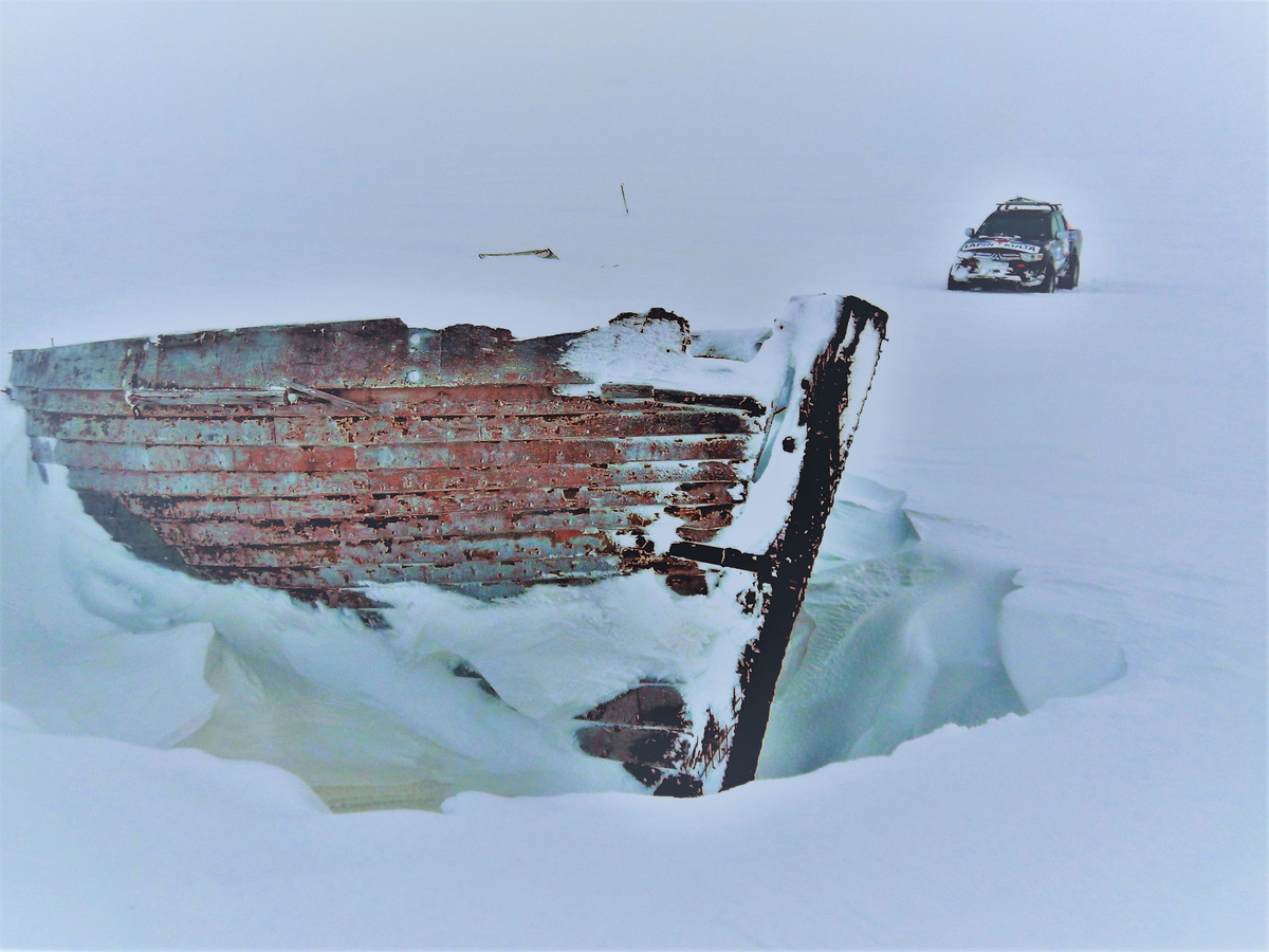 Машина висит над водой, и обойти её спереди и открыть капот невозможно – снежная корка настолько тонкая и хрупкая, что человека не держит совсем. На колесо встать одному ещё можно, но дотянуться и открыть капот не получается. А вдвоём встать на передние колёса – перевесим морду и утопим машину. И вдруг смотрим, а прямо на нас какое-то судно движется! Мамочки мои! Пришлось начать работать в несколько раз быстрее. И, наверное, благодаря движущемуся прямо на нас ледоколу, мы каким-то чудом изловчились и кое-как открыли капот, зацепили провода. Но ледокол при приближении начал немного забирать влево, что нас не могло ни радовать.