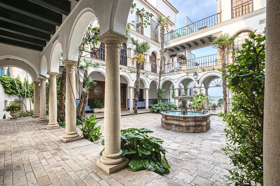Его прохлада, журчание фонтана и аромат апельсиновых цветов делают дом живым существом, дышащим в ритме южной жары. К нему часто также присоединены галереи (по сути открытые коридоры) с арками, а в центре журчит фонтанчик: