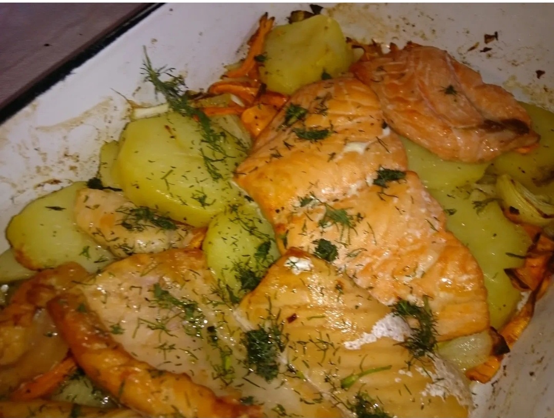 📌Ингредиенты: - Филе семги — 600 г - Картофель крупный — 4-5 штук - Чеснок — 3-4 зубчика - Растительное масло — 3 столовые ложки - Сливочное масло — 50 г - Лимонный сок — 1 столовая ложка - Смесь итальянских трав — 1 чайная ложка - Сухой тимьян — 1 чайная ложка - Соль и чёрный молотый перец — по вкусу 📍 Этапы приготовления: ☑️1. Подготовить картофель: Очистите картофель, разрежьте каждый клубень на четвертинки и положите в глубокую ёмкость. Залейте растительным маслом, посолите, поперчите, добавьте сухие травы и перемешайте руками, чтобы специи равномерно распределились. ☑️2. Поместить картофель в форму: Переложите картофель в жаропрочную форму и отправьте в предварительно разогретую до 200 °C духовку на 20 минут. ☑️3. Обработать семгу: Семгу промойте, обсушите бумажным полотенцем. Натрите её солью, чёрным перцем, смажьте сливочным маслом и выдавленным чесноком. Полейте лимоном и присыпьте сухим тимьяном. ☑️4. Собрать блюдо: Через 20 минут достаньте форму с картофелем