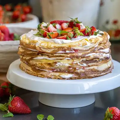 Слои нежных блинчиков, терпкая клубника и воздушный сладкий крем - всё это сочетается в этом великолепном блинном торте. Он исчезнет со стола за считаные минуты! Обязательно попробуйте приготовить этот блинный торт. Вот рецеп клубникного блинного торта. Для приготовления нам понадобятся вот эти продукты: тридцать блинов четыре стакана клубники нарезанной кубиками половина стакана сахара две столовые ложки лимонного сока 450 г сливочного сыра комнатной температуре половина стакана сахара три стакана жирных сливок для взбивания очень холодных половина стакана свежих ягод клубники для украшения. Время приготовления: 1 час 10 минут. Все нужные продукты мы собрали. Теперь начинаем готовить вкусный блинный торт с клубникой. 1. Приготовьте блинчики по своему рецепту. Для этого рецепта отлично подойдут блинчики диаметром 20 см. Для этого торта нужно делать более толстые блинчики, чтобы они выдерживали слои крема и ягод. 2. В небольшой кастрюле смешайте нарезанную кубиками клубнику, 1/2 стакана