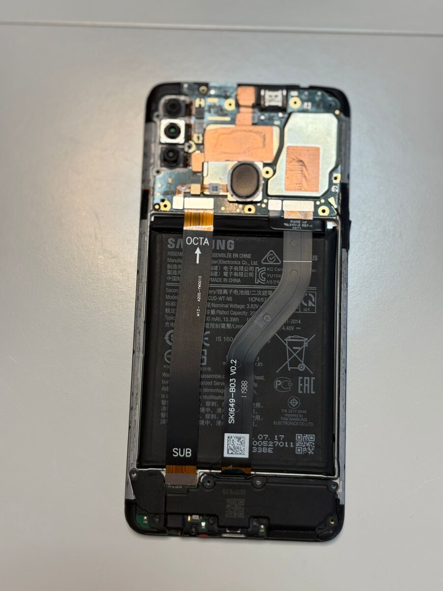 Приветствую всех, кто заглянул! Столкнулся с досадной проблемой: мой верный телефон Samsung наотрез отказался принимать энергию от зарядного устройства. Перепробовал все возможные комбинации блоков и кабелей, но тщетно. Пришлось взять ситуацию в свои руки и попытаться воскресить гаджет самостоятельно. Раз проблема не во внешних источниках питания, значит, корень зла кроется где-то внутри. Итак, я приступил к хирургическому вмешательству и разобрал корпус своего "пациента" до состояния, запечатленного на фото ниже. Не буду утомлять вас подробным описанием процесса разборки. Этот увлекательный ритуал на данном аппарате можно увидеть во всей красе в одном из видео на моем канале посвященном замене дисплея. Вот ссылка для любопытствующих: https://dzen.ru/video/watch/67b03055eba3ab3083c5bc43 Далее я тщательно исследовал все шлейфы и контакты на платах. И вот, момент истины! Оказалось, что при надавливании на определенную точку, обозначенную на следующем фото, при подключенной зарядке, на ди