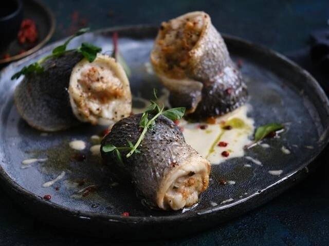 Выложите начинку на каждое филе рыбы и сверните рулетом.
