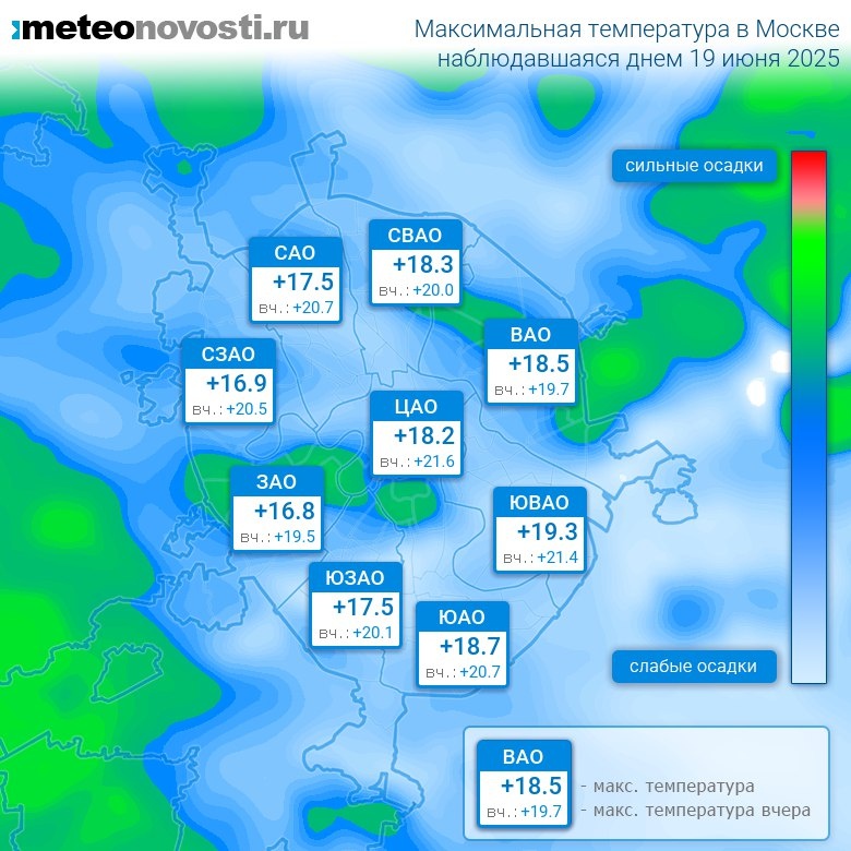 #за12часов #день Прошедший день 19 июня оказался на 1.5°C холоднее вчерашнего. Максимальная температура днём в Москве была на 4°C ниже нормы, что немного холоднее, чем обычно. Самая высокая температура +19.3°C была зафиксирована в 13 часов на юго-востоке города, а холоднее всего было на юго-западе: +14.4°C. Разница по максимальной температуре в разных частях столицы составила за день целых 4.9°C. Максимальные порывы ветра днём достигали 11 м/с. Атмосферное давление за день повысилось с 735 до 736 мм.рт.ст. Повсеместно прошли небольшие осадки. Больше всего осадков выпало на западе города – 3.9 мм. Самый теплый день в Москве 19 июня был в 1897 году, когда максимальная температура составила +31.8°C, а холодный в 1880 году: +10.9°C. Перейти на сайт Прогноз погоды на 14 дней
