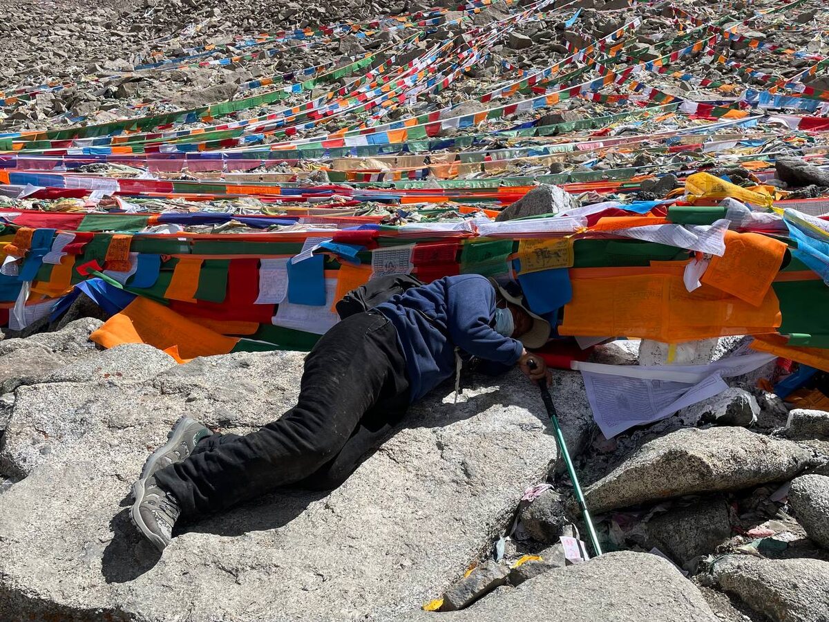 Перевал Дрома Ла. Говорят, что поднявшись на него человек испытывает массу необычных эмоций и ощущений. Ну, вроде как, перерождается. Ничего по этому поводу сказать не могу. Ибо не ощущениями я была занята, а участниками своими, надо было убедиться, что все они в порядке. Всё-таки высота 5620 метров – это уже серьёзно. Кроме этого от заныривания во внутренний мир меня отвлекало желание смотреть на мир внешний. За людьми наблюдать интереснее, чем в себе копаться. Люди были разные и вели по-разному. Кто-то спал после тяжёлого подъёма, кто-то повязывал свои флажки с мантрами, кто-то раскидывал какие-то бумажки (тоже очевидно с мантрами). Кто-то посмотрев на фотографии с перевала, которые я уже публиковала, справедливо заметил: «Сколько же там мусора.» Увы, да. Неудобно называть флажки с мантрами мусором, но что есть, то есть. Они огромным культурным слоем опутывают склоны перевала. Вверху – разноцветно и нарядно. Внизу, под ногами – толстый слой старых рваных флажков. Во