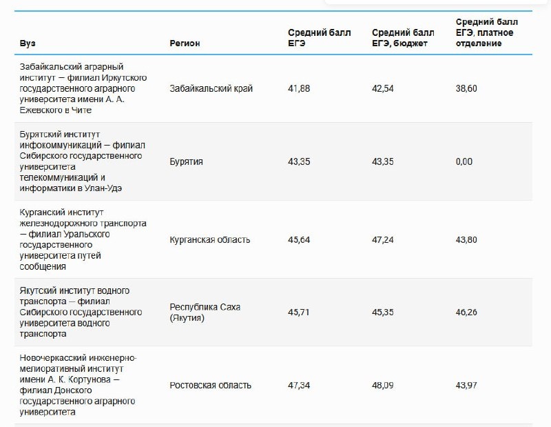 Перед началом приемной кампании в вузы появляются всевозможные рейтинги, которые, по идее, должны помочь в выборе абитуриентам. В Forbes Education составили топ-100 самых «доступных» вузов России — куда можно поступить с низкими баллами ЕГЭ. Подход может показаться странным для издания, ориентированного на людей обеспеченных, но, как мы знаем, высокий доход не гарантирует высоких баллов. Итак, тем, у кого ЕГЭ ниже 40, Forbes рекомендует отправляться в провинцию. Самый низкий средний балл у бюджетников был в Саратовской области в Поволжском кооперативном институте (42,3), а у платников — в Забайкальском аграрном институте (38,6). Самыми «мягкие» требования к поступающим в Ростовской области, где сразу 8 представителей в топ-100 (средний балл ЕГЭ — 52,05). По 4 их в Приморском крае, Челябинской области и Нижегородской области. 53% вузов в общем списке — филиалы (в Ростовской области — 5 из 8). Что касается направлений обучения, то 30% университетов в топ-100 — аграрные, по 25% —тран