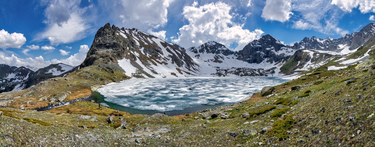 Озеро Уллу-Кёль во всей красе. Высота озера (да, именно высота :) - 2850 метров. Озеро большое - одно из крупнейших озёр Карачаево-Черкесии ~650x300 метров. Так и переводится с карачаевского - "Большое озеро". Из озера вытекает река Кичкинакол - вы видите её в левой части кадра. И буквально в 20-30 метрах от истока река обрывается вниз каскадом небольших водопадов. Температура воды в озере даже в середине лета не поднимается выше 6 градусов. Я купался в нём в середине июня. Ну как купался - полуминутный полоумный заплыв вокруг льдины с последующим отогреванием уже на берегу :) Вот к нему мы и пойдём в туре "Уллу-Кёль Ризот". А Ризот - это потому что Resort - все ночёвки на берегах речек/озёр, и ходим мы по берегам, так что я решил, что это вполне себе пляжный горный поход, поэтому Resort. Прошу любить и жаловать, и бронировать места в программе, либо запрашивать желаемые даты похода :))) #УллуКёльРизот P.S.: Сама фотография - панорама из 12 вертикальных кадров, поэтому такая длинная.