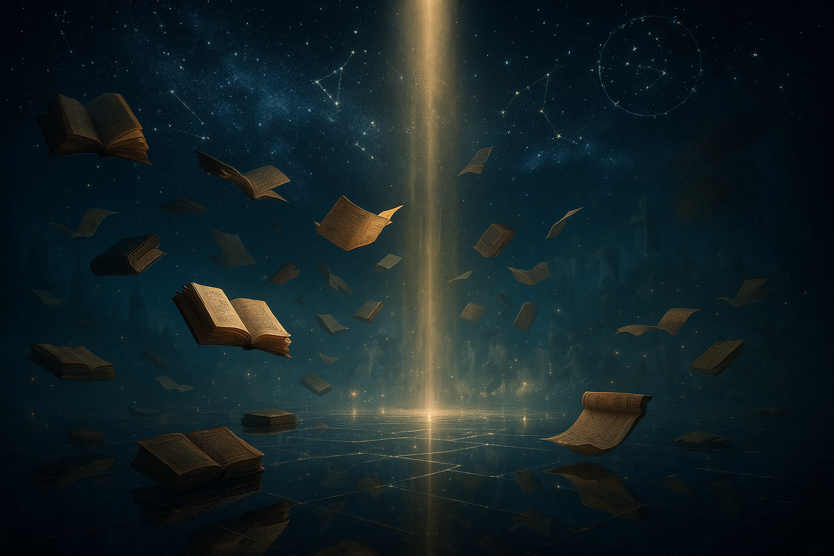 Тишину нарушил шорох – из тени выплыли бесчисленные свитки и книги, парящие в воздухе. Они перешёптывались едва слышно, как дальний прибой, шуршали переворачиваемыми страницами. В самом центре зала струился столп мягкого золотистого света. В этом сиянии показалась высокая фигура.