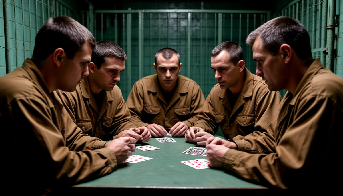 Все заключённые сидели в камере. Джим сидел около Саши, “Варюга Гарри” что-то строгал в углу, “Чеполино” сидел на корточках около прутьев, а Коля что-то рассматривал в руках. В комнате повисло странное молчание, но вдруг, пробивая тишину, “Бородатый Колян” подошёл к “Саше Костелому” и крикнул: — Ха! А знаешь, что у меня есть!? — Ты-то в игры со мной не играй… Рассказывай быстро, что ты там для меня припрятал!? На это “Бородатый Колян” протянул к Саше обе руки, что-то пряча. В тот момент его лицо, покрытое густой чёрной бородой, выглядело на редкость добрым, даже весёлым. “Саша Костелом” хмуро посмотрел на него, а “Бородатый Колян”, поправив свою коричневую робу, улыбаясь, раскрыл руки. Вдруг лицо Саши блеснуло странной и даже слегка пугающей улыбкой во все зубы. Он крикнул: — Да это же карты! — В этот момент вся темница обернулась к ним. Коля, слегка потирая свою бороду, подмигнул и отдал карты “Саше Костелому”. В этот момент “Чеполино”, быстро обернувшись, устремил свой глуповатый вз